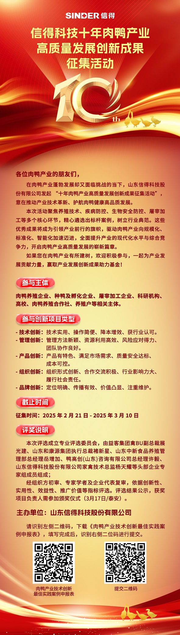 近年來,中國肉鴨產業發展跌宕起伏,機遇與挑戰并存。國內市場對鴨肉需求穩步增長,推動養殖規模擴大,集約化、規模化養殖模式成為主流,養殖區域分布更加集中。肉鴨產業面臨諸多挑戰,疾病防控難題突出,傳統疫病周期性肆虐,新型疾病發病機理復雜、傳播速度快,養殖密度、環境變化及種鴨品質等因素加劇了疾病的爆發頻率與危害程度。為深入探討肉鴨行業的增長策略,剖析產業的現狀與未來走向,持續推進肉鴨產業的高質量發展。山東信得科技股份有限公司定于3月17日在泰安舉辦第十屆中國肉鴨產業健康發展與疾病防控高峰論壇。本次會議將重點分享這十年來行業創新支撐高質量發展的最佳實踐,激勵更多從業者投身創新發展,共同推進行業高質量、有效率地增長。為進一步推動肉鴨產業技術創新,提升產業發展質量,本次大會特地組織十年肉鴨產業高質量發展創新成果征集活動。