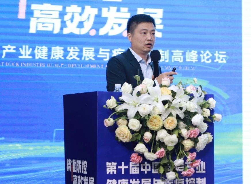 為從源頭提升鴨苗質量,助力肉鴨健康養殖,和康源集團技術總監汪建華先生帶來《鴨苗質量控制研究進展及實踐》的成果分享。汪總監指出,鴨苗質量的好壞是關系肉鴨養殖成敗最根本的要素之一,禽苗差直接導致垂直傳播疾病發生或繼發疾病,增加死淘,降低成活率;劣質禽苗疾病多,菌株耐藥性強,用藥多,增加成本。商品肉鴨的疫病防控,要延伸關注到種鴨場的生物安全、防疫制定、生產孵化過程、鴨苗運輸等環節。會上,他還詳細介紹了鴨細小病毒、新型鴨呼腸孤病毒、鴨病毒性肝炎等疫病防控方案,通過建立鴨苗質量標準以及動保投入品的標準,為鴨苗質量控制提供了系統的解決方案。
