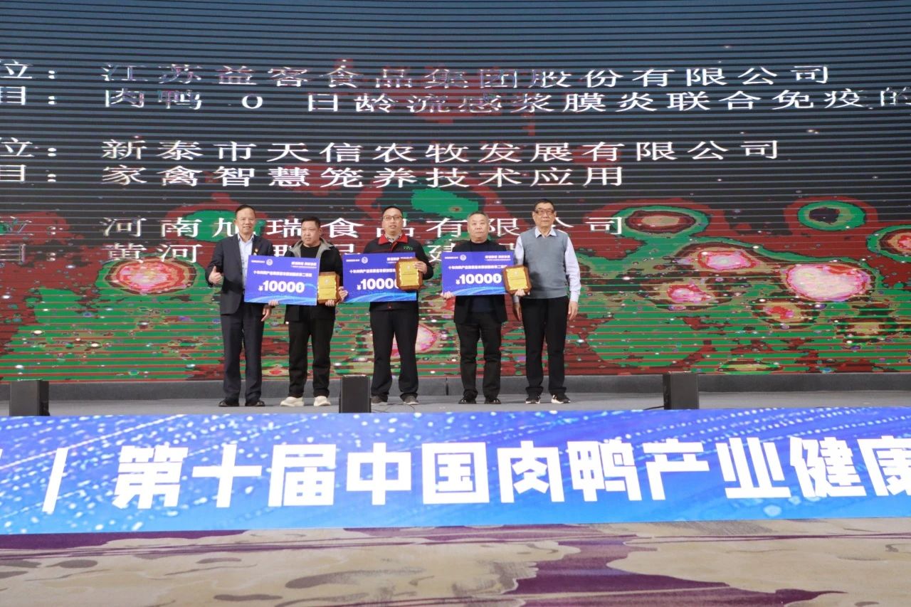 為推動肉鴨產業轉型升級、突破發展瓶頸,在中國肉鴨產業健康發展與疾病防控高峰論壇十周年之際,信得科技特別組織了肉鴨產業高質量發展創新成果征集和評選活動。活動自啟動以來,受到了行業的廣泛關注,收到二十家企業提交的37項創新項目。經過組織方與專家評審委員會的嚴格評審,最終評選出一等獎1名、二等獎3名、三等獎8名以及優秀提案獎9名。獲獎項目涵蓋技術創新、品牌創新、組織創新、管理創新、產品創新等維度,充分展示了近年來肉鴨產業在高質量發展道路上的創新實踐和突出成就。其中,實體平臺“鴨高創(山東)咨詢有限公司”的創立榮獲一等獎,該公司由益客、信得科技等9 家企業于2023年聯合出資組建,公司以整合資源、優勢互補、互惠互助、產業合力、高質量發展為核心理念,致力于打造一個產業協同平臺,通過技術創新與升級,為中國肉鴨產業的高質量健康發展提供強大助力。截至目前,有14項基礎研究,35項速贏項目,30余項應用驗證以及一批中長期研發項目已經或正在實施推進,取得了明顯的產業經濟效益。此外,益客集團的肉鴨 0 日齡流感漿膜炎聯合免疫的推廣、新泰天信農牧的家禽智慧籠養技術應用、河南旭瑞公司的黃河土鴨品牌建設等三個項目榮獲二等獎;益客集團的育種打破壟斷、動保戰略供應商的合作體系建立、中新食品的商品肉鴨籠養綜合技術研究、圣灃食品的肉鴨無抗生素養殖、和康源集團的庫倫鴨品牌建設及鴨苗質量動態監測、樂壽農牧的樂壽烤鴨坯、山東榮達農業的肉鴨集中育雛、以及信得科技的基于自動稱重的牧云養殖管理物聯網平臺等8個項目榮獲三等獎。