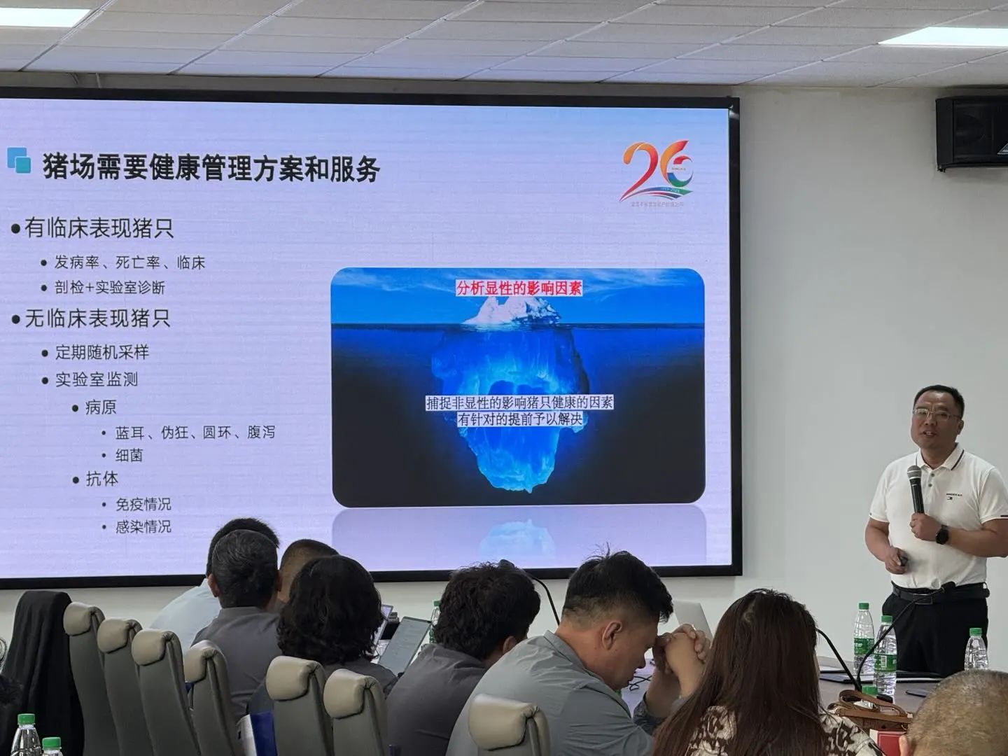 蘇圣華老師圍繞 “技術服務體系賦能豬場健康管理” 展開分享。針對豬場細菌病頻發、生物安全成本高等痛點,信得構建的 “技術服務經理 + 產品經理 + 客戶經理” 三位一體服務體系,整合檢測中心、研發中心等資源,通過KOL建設、駐場服務、精準方案制定等六大核心工作提升客戶價值。蘇老師還結合多例客戶服務案例,介紹了信得通過疾病檢測、駐場服務等工作對提升斷奶仔豬成活率、解決腹瀉等重點項目的成果。會上,蘇老師還重點對信得 & 海利的藍耳、偽狂犬、豬瘟、腹瀉、圓環類疫苗產品的特點作詳細介紹。他強調,信得將持續優化服務體系,深化戰略客戶合作,為客戶提供確定性價值。