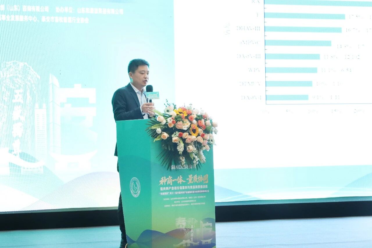 會上,田家軍部長以“信得科技種商一體化及精準防控實踐”為題作報告,從疾病防控維度闡述了種商一體化的技術路徑與落地成效。他指出,種商一體化的關鍵在于打通種鴨、孵化及商品肉鴨全鏈條,鴨苗早期病原陽性率隨日齡增長顯著上升,防控重心必須前移至種源端。以呼腸孤病毒防控為例,監測數據顯示,種鴨開產前完成2次以上呼腸孤疫苗免疫,可顯著提升鴨苗母源抗體水平。田部長還重點分享了信得“精準防控”戰略:通過精準流調檢測結果及時準確識別流行菌株及其變化趨勢,據此通過精準定制開發更新解決方案以應對流行菌株,并通過精準評估持續追蹤臨床療效,支持客戶持續優化防疫和保健方案,實現動物疾病的精準防控,提升養殖效益和產品品質。