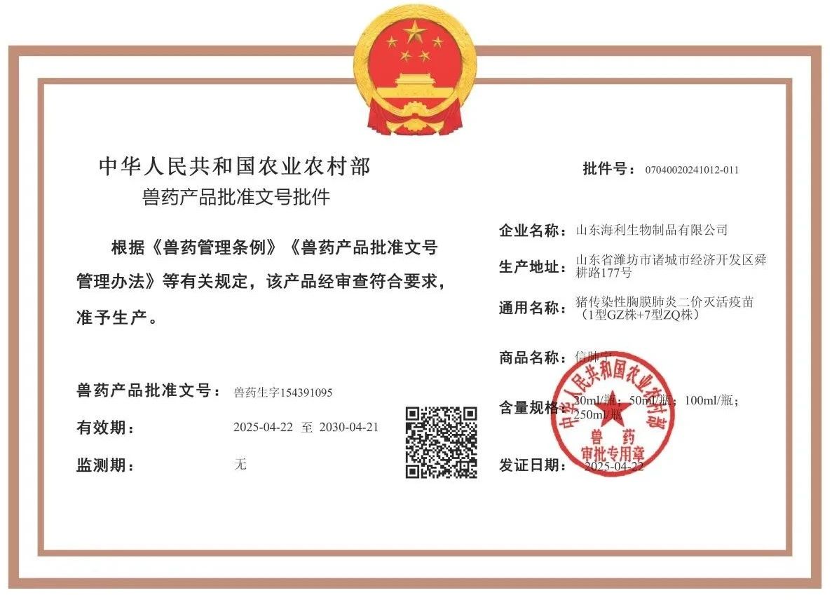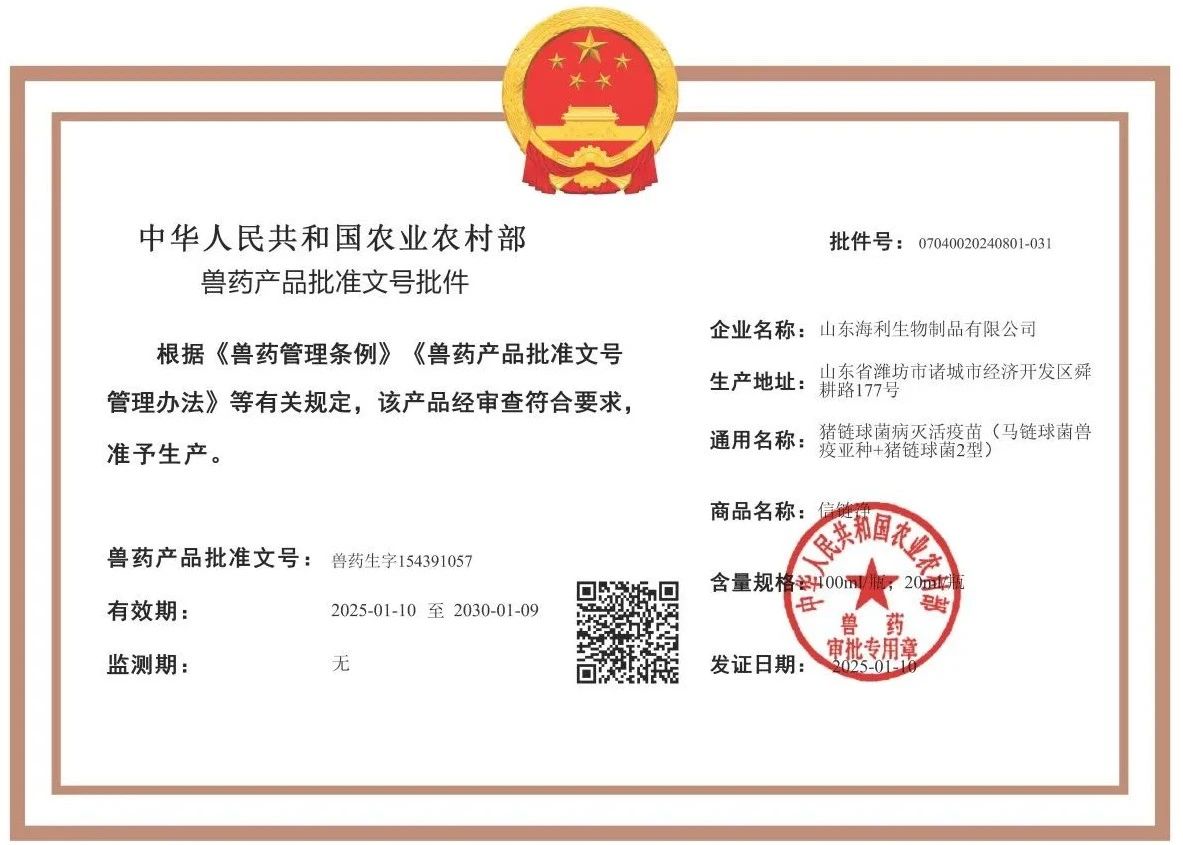 近日,信得科技獲得豬傳染性胸膜肺炎二價滅活疫苗、豬鏈球菌病滅活疫苗 2 個獸藥產(chǎn)品批準文號。