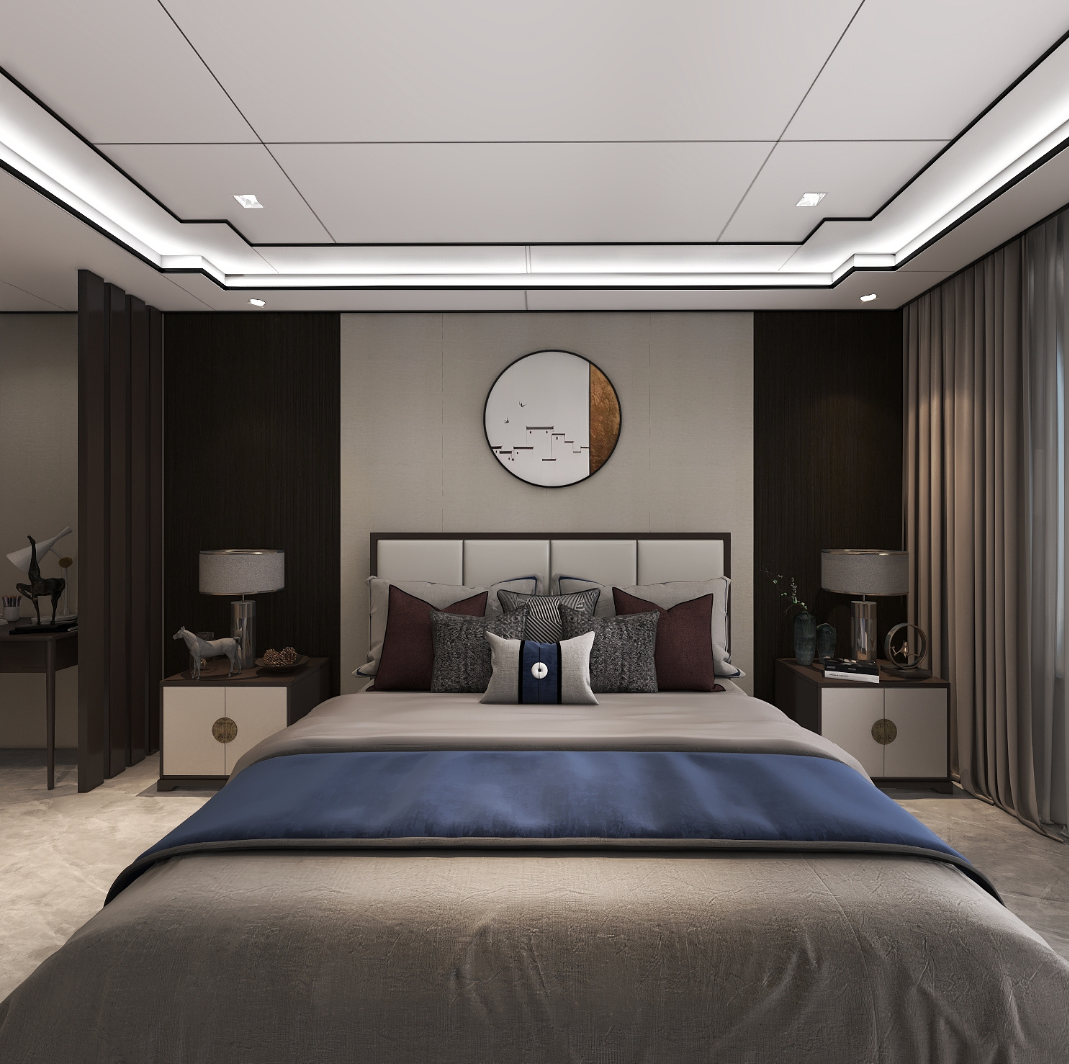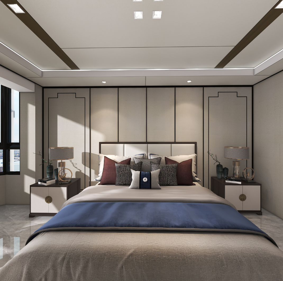 臥室背景墻兩側(cè)木飾面墻板對稱分布,床頭適當(dāng)留白,利落的裝飾線條,中間搭配一副好看的山水裝飾畫,豐富空間層次,在濃濃古韻中滲透幾許現(xiàn)代氣息,與新中式風(fēng)格交融而不違和。