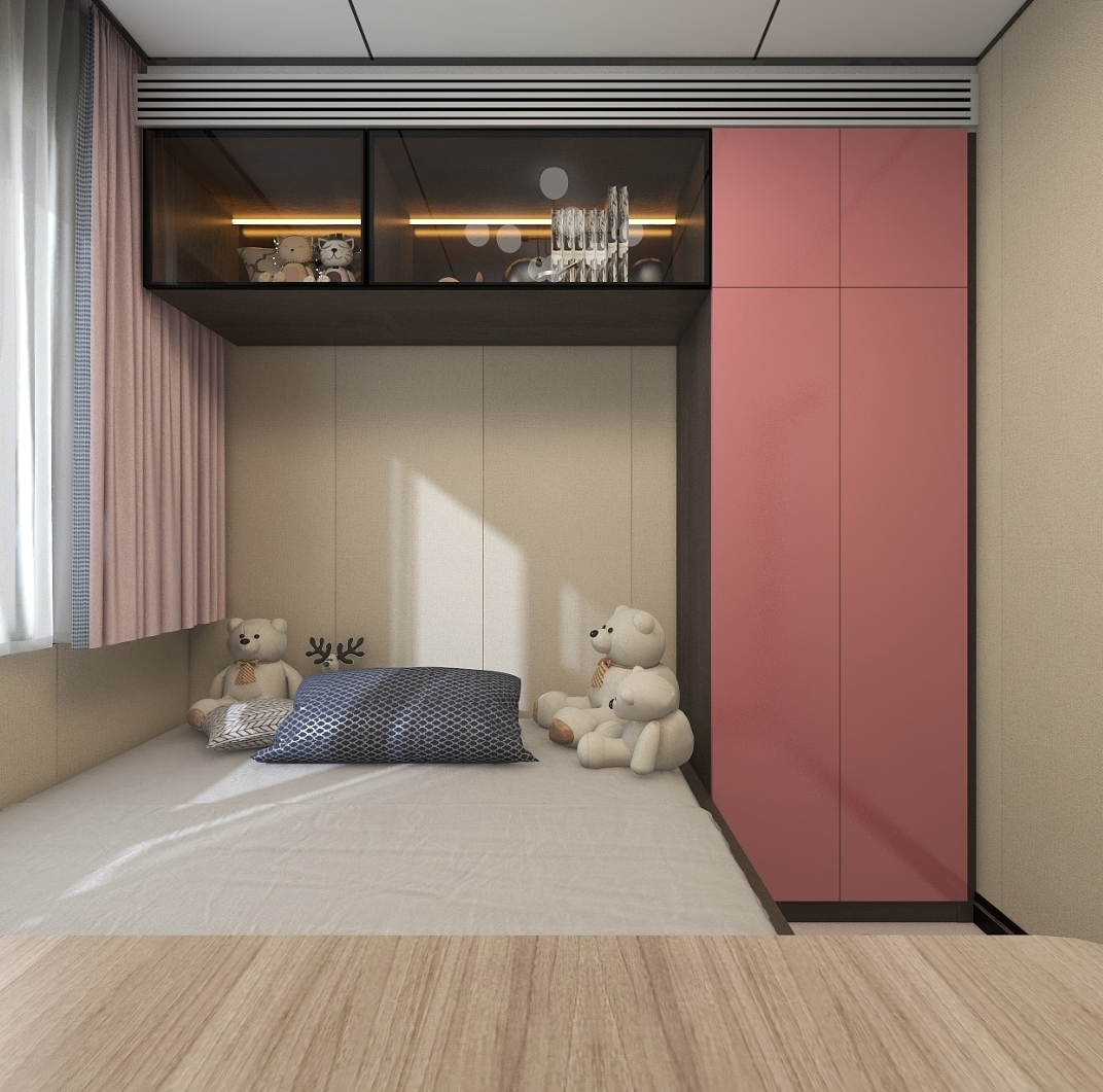 兒童房不大,靠窗定制榻榻米,提高了空間利用率,滿足小孩子收納等需求,功能強(qiáng)大!墻面沿用主次臥同色布紋墻板,使整體風(fēng)格統(tǒng)一。